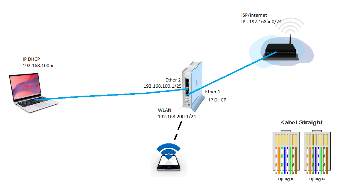 Dalam kegiatan uji kompetensi ini anda bertindak sebagai Network System Administrator. Tugas anda sebagai Network System Administrator adalah merancang bangun dan mengkonfigurasi sebuah Wifi Router yang berfungsi sebagai Gateway Internet, Hotspot dengan RADIUS,Web Proxy, dan Firewall, kemudian internet tersebut di-share ke client melalui jalur kabel dan wireless secara DHCP.